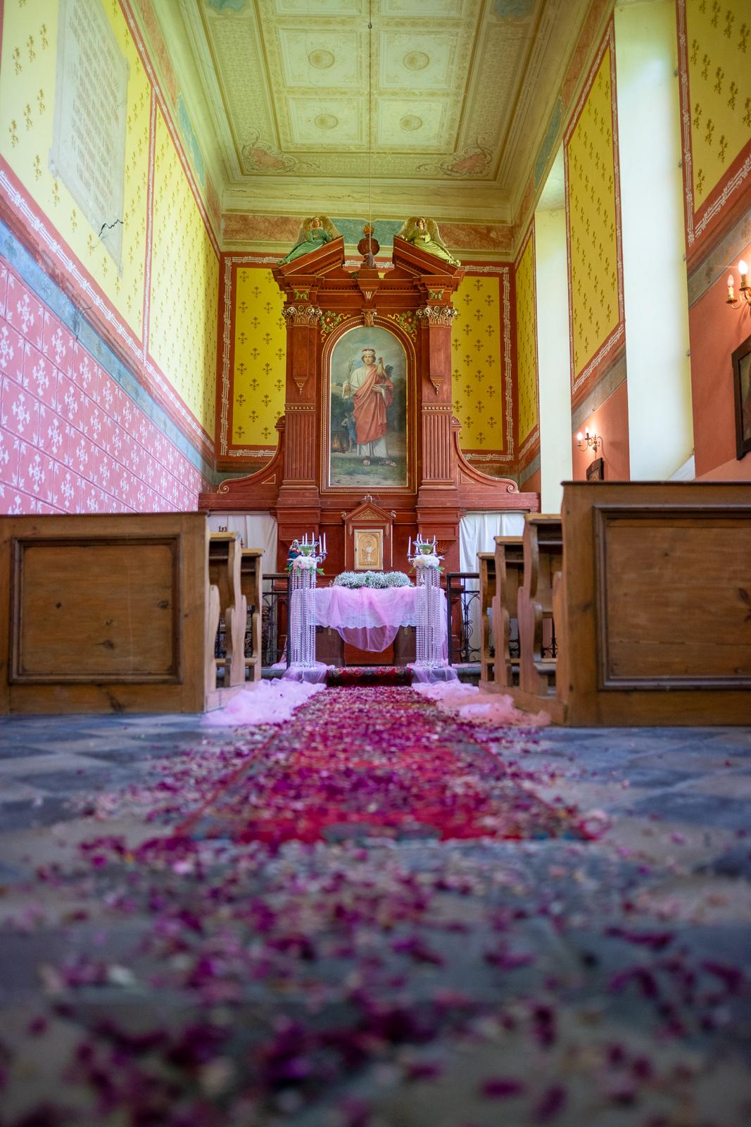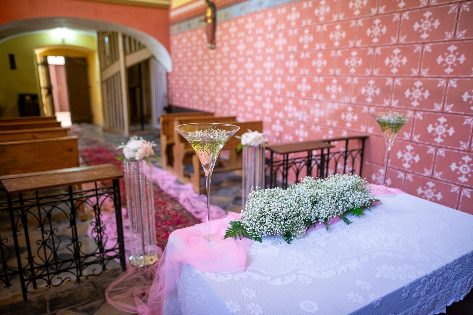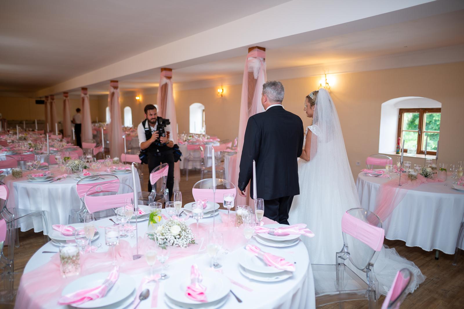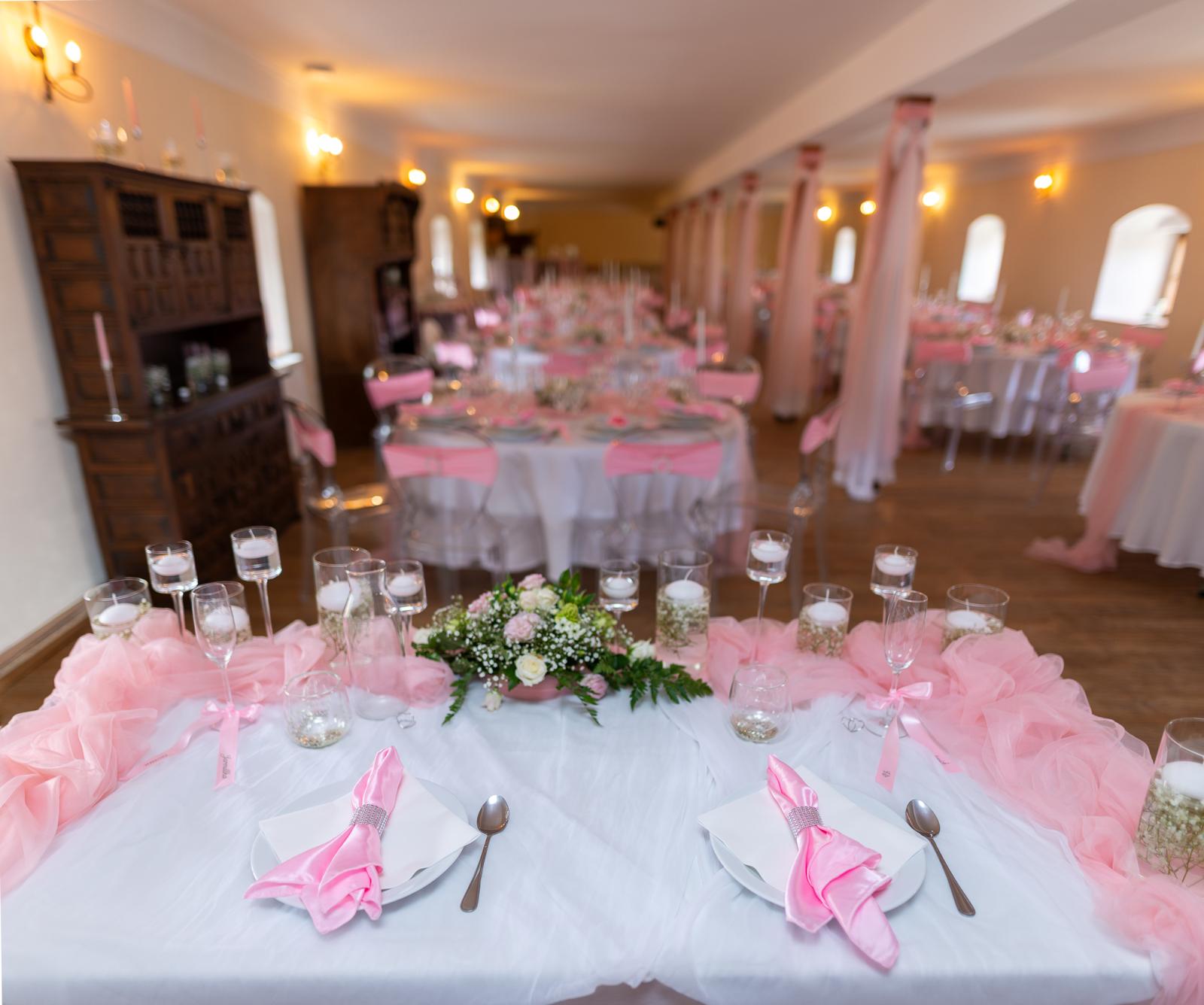 Zámek Lešany se na chvíli proměnil v růžové království! Nevěstino přání znělo jasně: „Chci růžovou. Všude. Hodně!“ Já bych sice sáhla po jiné paletě, ale když si nevěsta přeje růžovou, dostane růžovou.